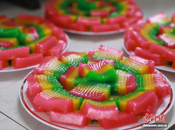 图为切块装盘的斑斓糕。汤晓逵 摄