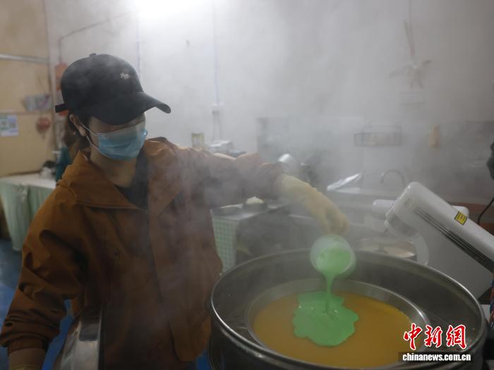 图为罗雪葵将斑斓糕原料倒入锅中蒸制。汤晓逵 摄