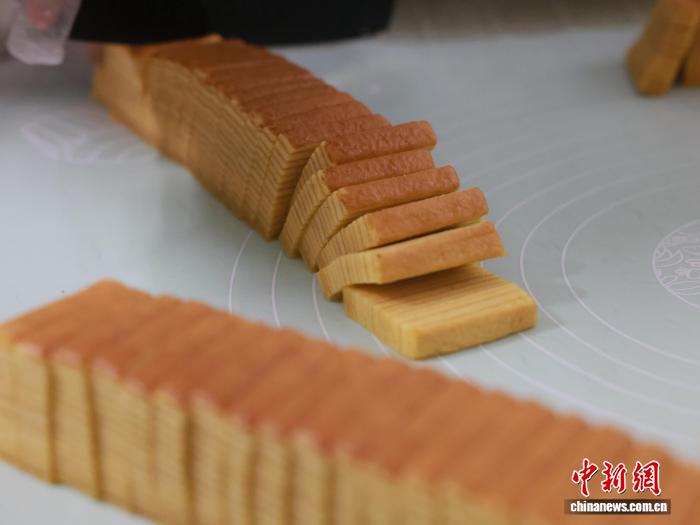 图为千层糕切块。汤晓逵 摄