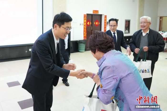 2月4日,由中国驻尼泊尔大使馆主办的慰侨新春茶话会在尼首都加德满都举行。图为中国驻尼泊尔大使馆临时代办周攀(左)为侨胞发放“新春暖心包”。记者 崔楠 摄