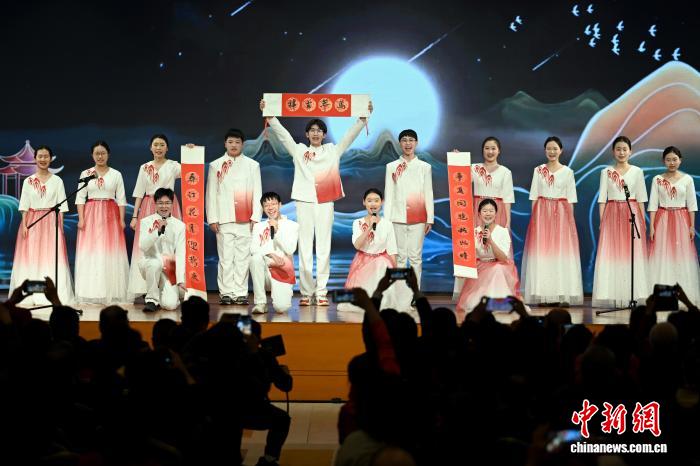 当地时间2月6日,华盛顿,中国驻美大使馆举办“温暖迎春·共庆中国年”侨学界专场新春招待会。图为赴美参访的上海市卢湾高级中学学生代表表演诗朗诵。中新社记者 陈孟统 摄