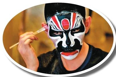 英歌表演前,马来西亚华人王凯杨描画脸谱。