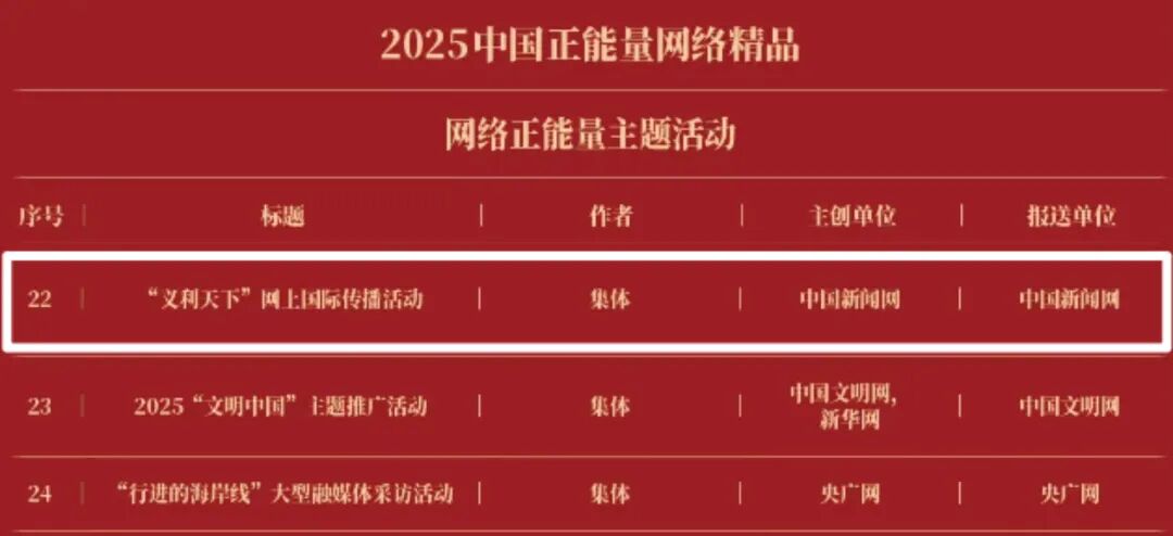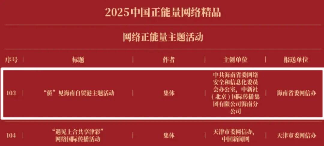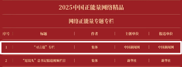 《“新漫评”系列漫画》《“三里河”专栏》入选2025中国正能量网络正能量十佳网络精品。 《高清大图看阅兵》《青春的关键词,是他们的模样》入选2025中国正能量网络精品网络正能量图片;《英国博主深入日本街头采访:民众批评高市介入台湾问题》《异国“故乡”》入选2025中国正能量网络精品网络正能量音视频;《“习言道”专栏》《华侨华人与抗战》入选2025中国正能量网络精品网络正能量专题专栏;《“冰雪春天”全网重大主题活动》《“义利天下”网上国际传播活动》《“探店1天”系列报道》《“侨”见海南自贸港主题活动》《“遇见上合共享津彩”网络国际传播活动》入选2025中国正能量网络精品网络正能量主题活动。