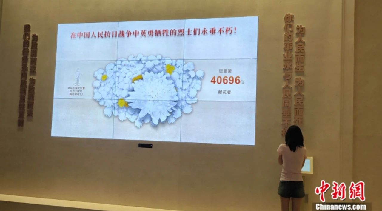 《为了民族解放与世界和平》主题展览在中国人民抗日战争纪念馆面向社会公众开放。在“弘扬伟大抗战精神 深切缅怀抗战英烈”专区,观众自发献花,缅怀先辈。中新社记者 杜燕 摄