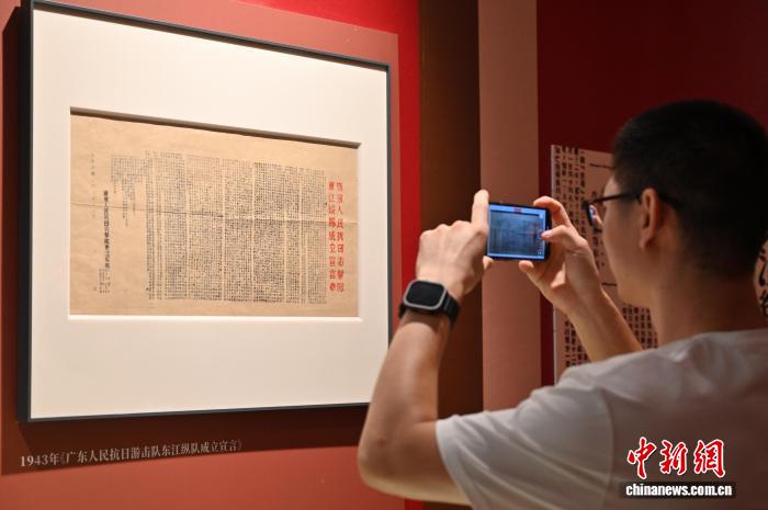 图为《广东人民抗日游击队东江纵队成立宣言》(二级文物)吸引参观者拍摄。中新社记者 陈楚红 摄