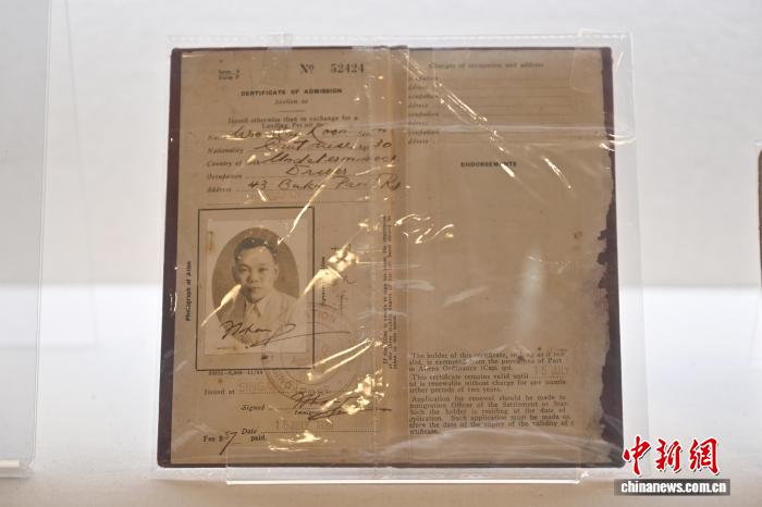 图为展览展出1939年马来亚南侨机工胡凯军的新加坡入境许可证。中新社记者 陈楚红 摄