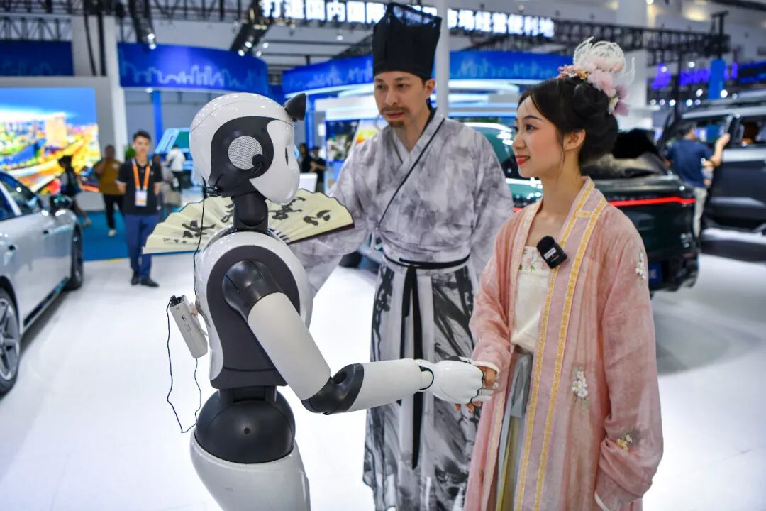 2024年4月15日,海南海口,第四届中国国际消费品博览会上,身着汉服的参观者与“柔美人形智能服务机器人”互动。中新社记者 骆云飞 摄