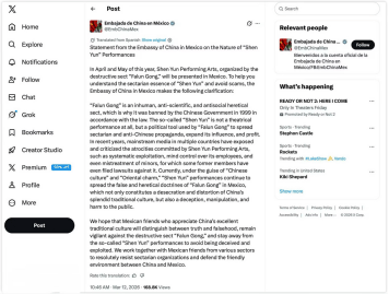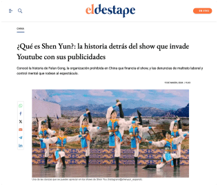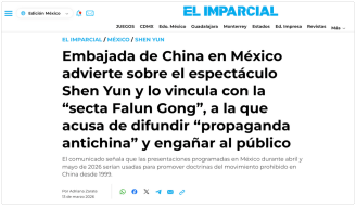 此外,当地时间3月15日,阿根廷媒体“El Destape”刊文指出,中国驻墨西哥大使馆近日通过社交媒体提醒称,“神韵演出”是与邪教组织“法轮功”相关的宣传,并呼吁墨西哥公众不要前往观看。文章进一步分析称,“神韵”表面上打着中国传统文化避风港的旗号,但在其华丽包装的舞台背后隐藏着地缘政治博弈、劳工虐待指控,以及邪教组织敛财工具的本质。